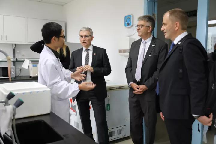 座谈会后,奥瑞克·劳弗一行先后参观了门诊自助服务区、腔镜培训基地、中心实验室、内镜中心、创伤中心等地,详细了解市二院环境设施、科研水平、服务流程等情况。